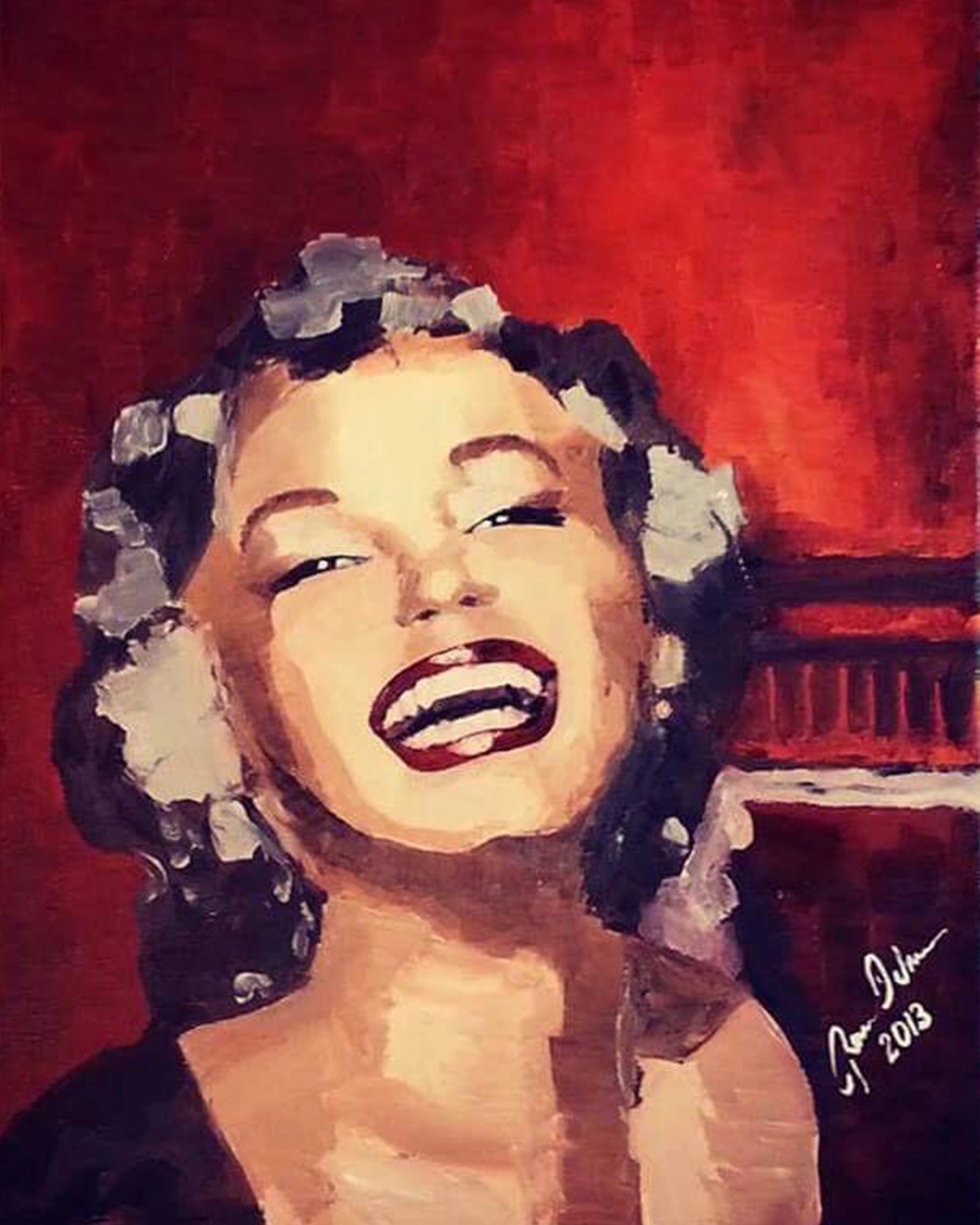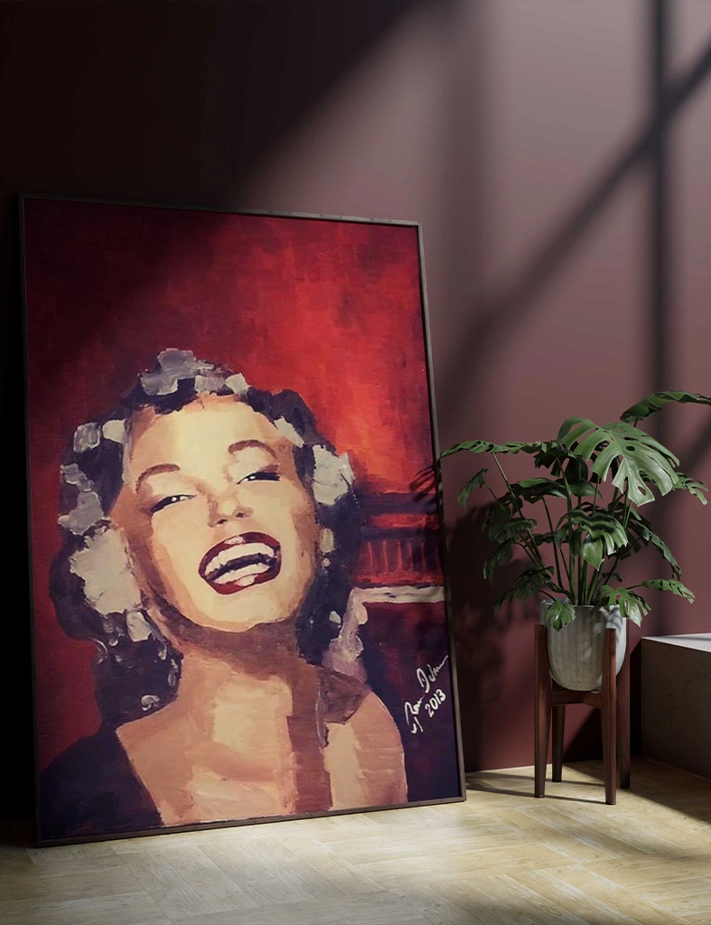 iconic blonde hair, bright smile, and glamorous appearance that’s characteristic of how Marilyn Monroe has been depicted in pop art and portrait paintings. The warm red background and the stylized painting technique are reminiscent of the many artistic interpretations of her that have been created over the years.