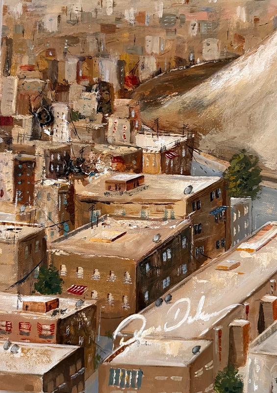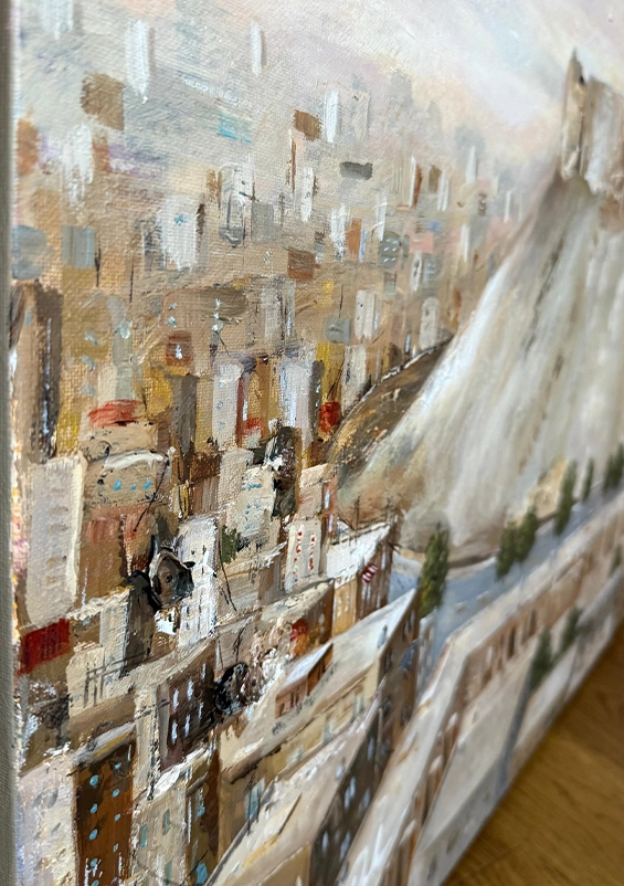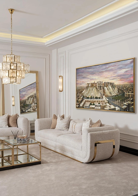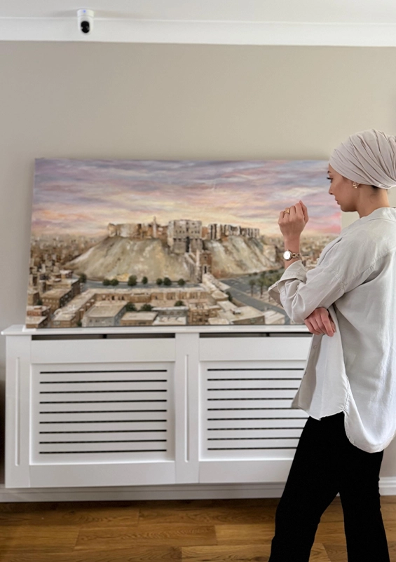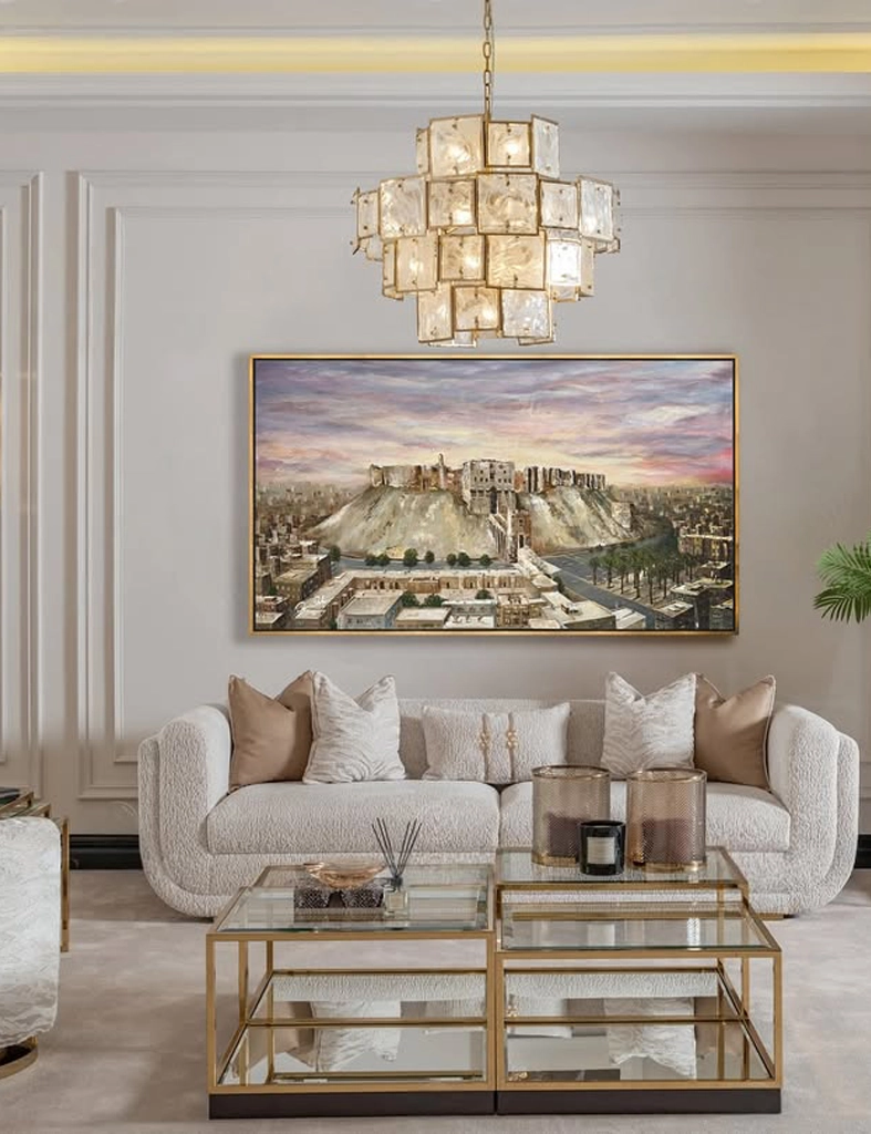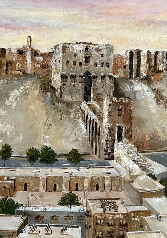 Through layered textures and warm, earthy tones, this canvas evokes the golden light of the ancient stones and the quiet strength that has watched over Aleppo for centuries.