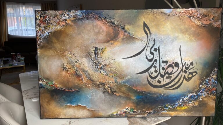 Set against a serene background of soft tones and textured layers, the calligraphy flows with balance and grace, symbolizing the harmony between divine blessing and human effort. Each brushstroke reflects a quiet acknowledgment that all success, beauty, and goodness come through the mercy and favor of God.
